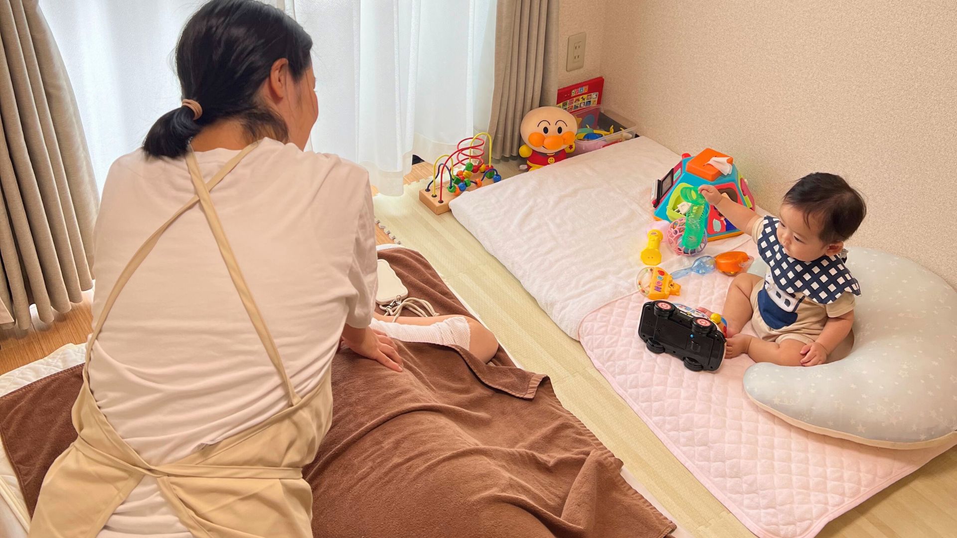 ママリラックスでは、子どもの年齢に合わせたおもちゃや絵本を用意。布団やバウンサー、動画が見られるiPadも完備で、赤ちゃん連れでも安心。