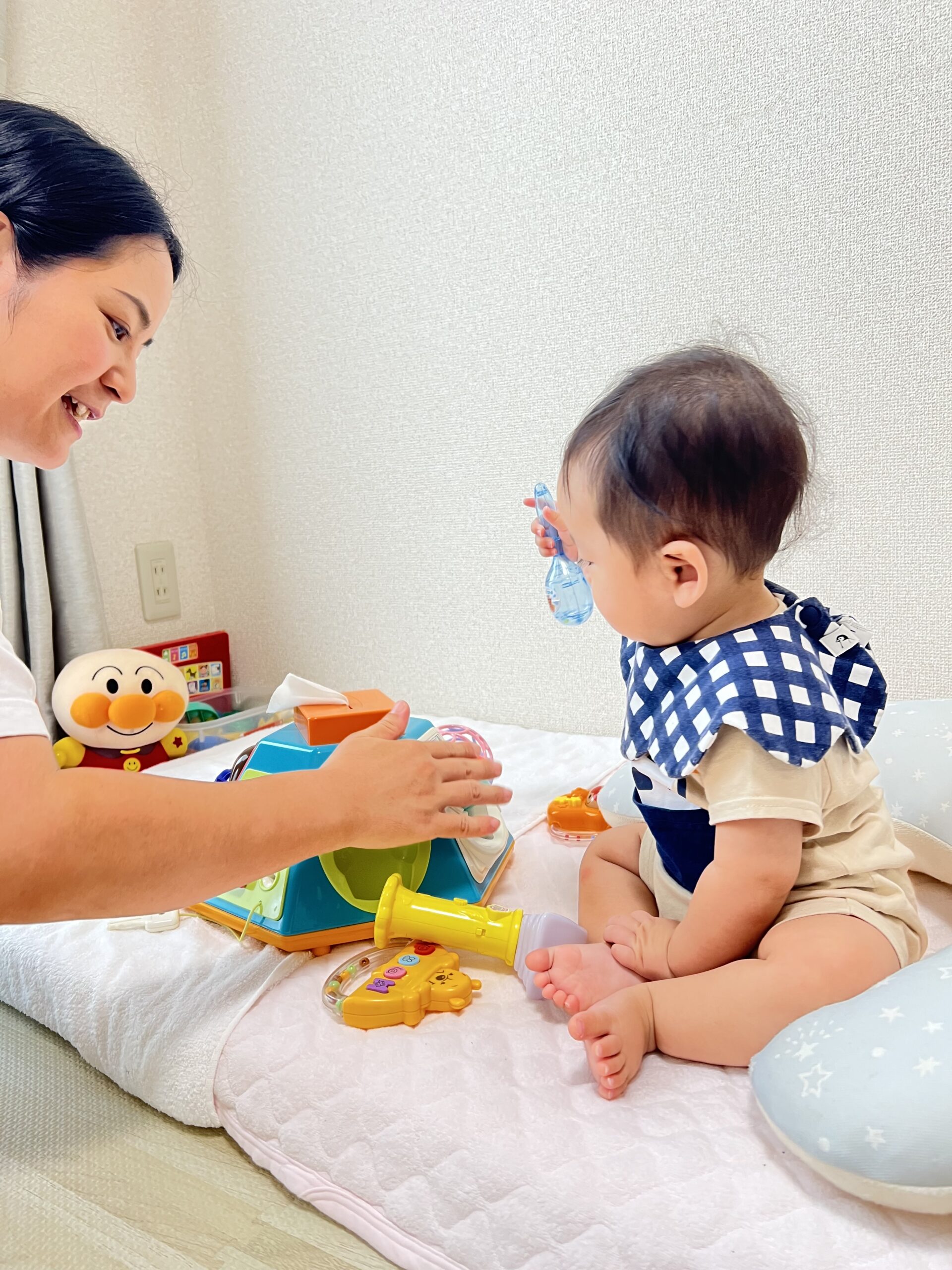 おもちゃ・絵本・バウンサー・動画など、お子さまの年齢に合わせたアイテムで待ち時間も楽しく。